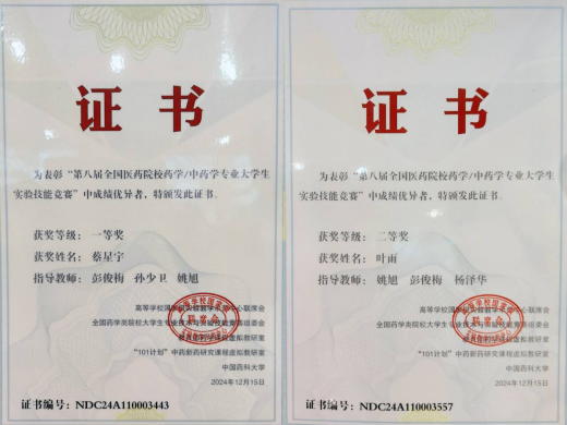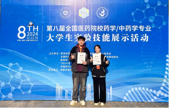 近日,第八届全国医药院校药学/中药学专业大学生实验技能竞赛决赛在成都中医药大学落下帷幕。经过激烈的角逐,MK平台药学院2021级药学专业的蔡星宇和叶雨同学发挥出色,分别获得一等奖和二等奖,创下历年来最佳赛绩。
