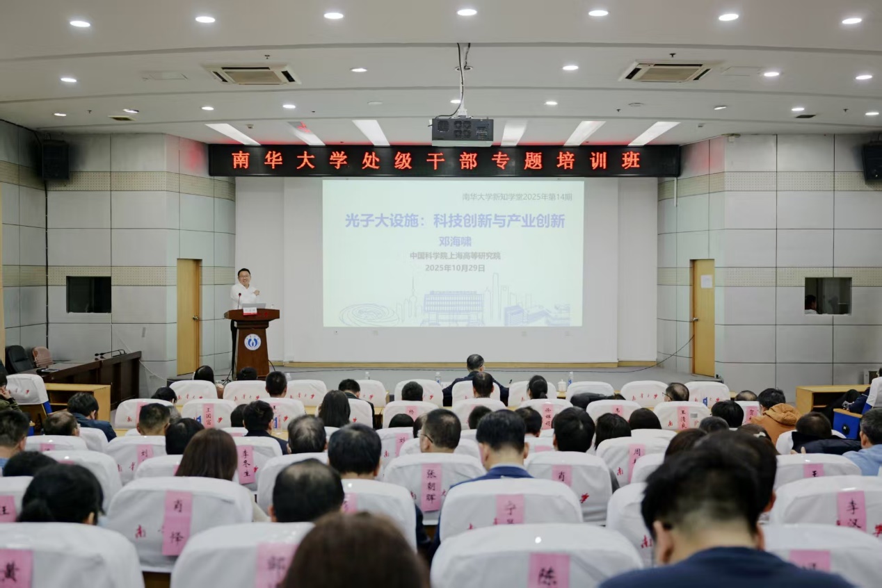 10月29日晚,MK平台2025年第14期新知学堂在红湘校区图书馆开讲。中国科学院上海高等研究院副院长、大科学装置管理中心主任邓海啸研究员以“光子大科学设施:科技创新与产业创新”为题作学术报告。党委委员、校纪委书记陈列尊主持报告会。